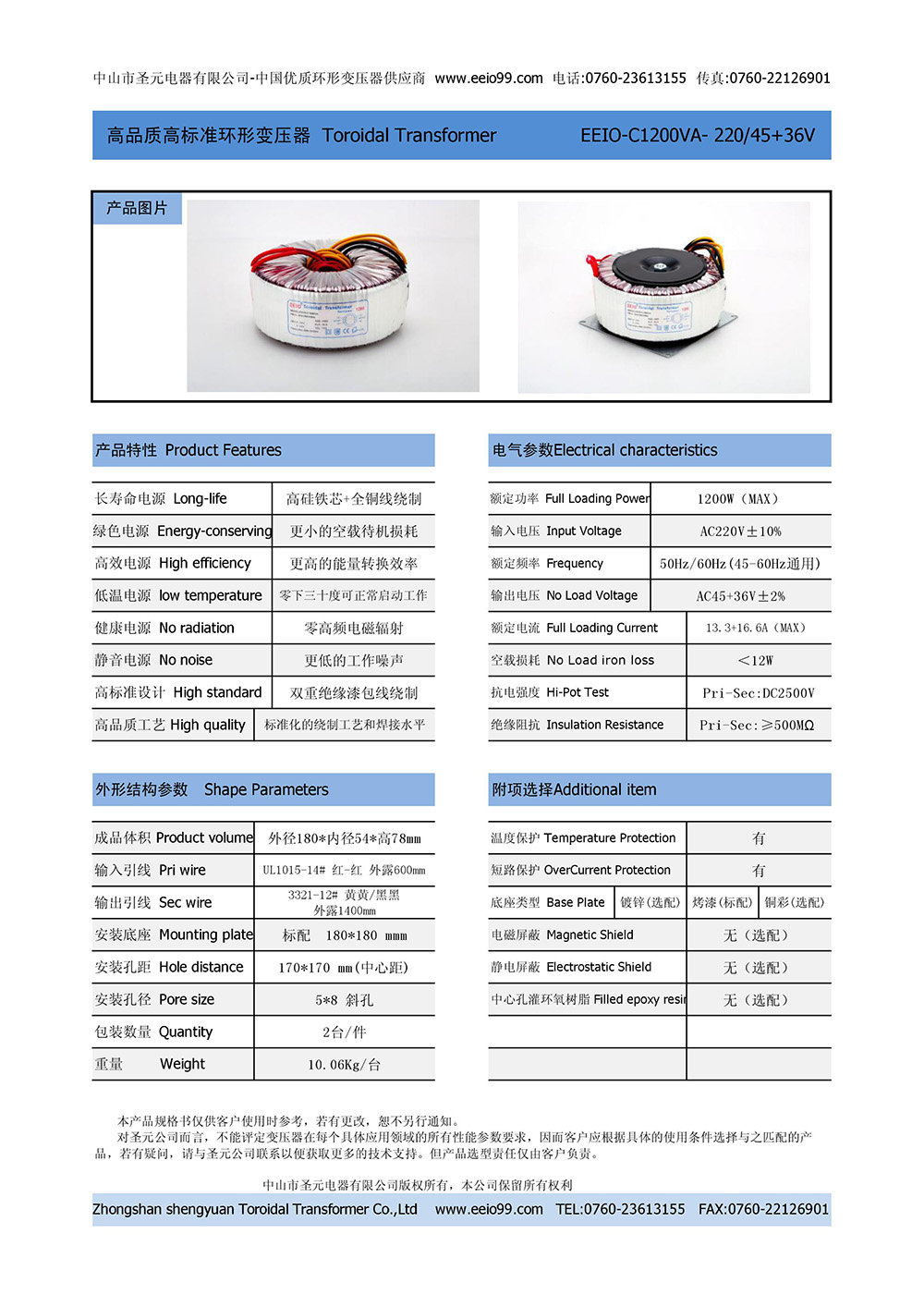 [環(huán)形變壓器] 單相變壓器1200W,220V轉(zhuǎn)36V-45V【帶溫控短路保護(hù)】產(chǎn)品功率:1200W |